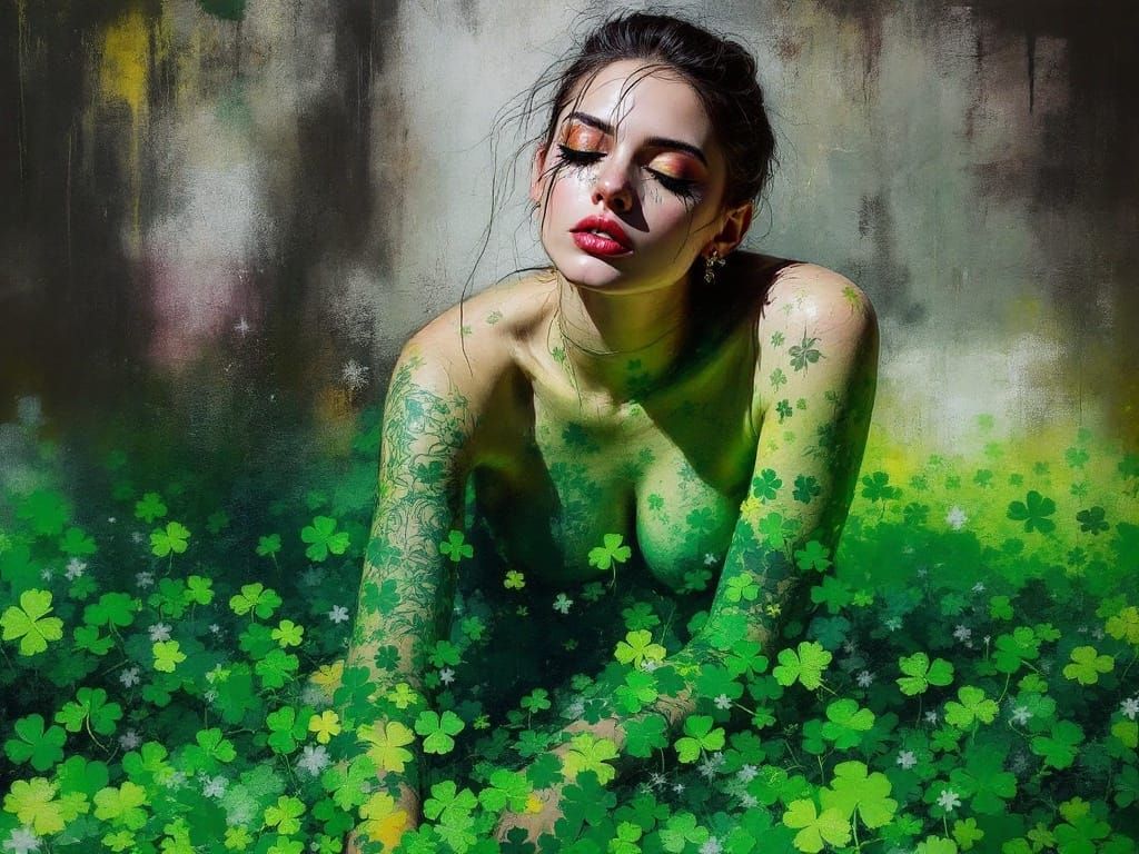 This image features a young woman surrounded by the vibrant colors of spring, her skin adorned with a field of shamrocks. The artwork blends classical composition with urban spontaneity, showcasing dramatic chiaroscuro lighting and raw symbolic expressionism.