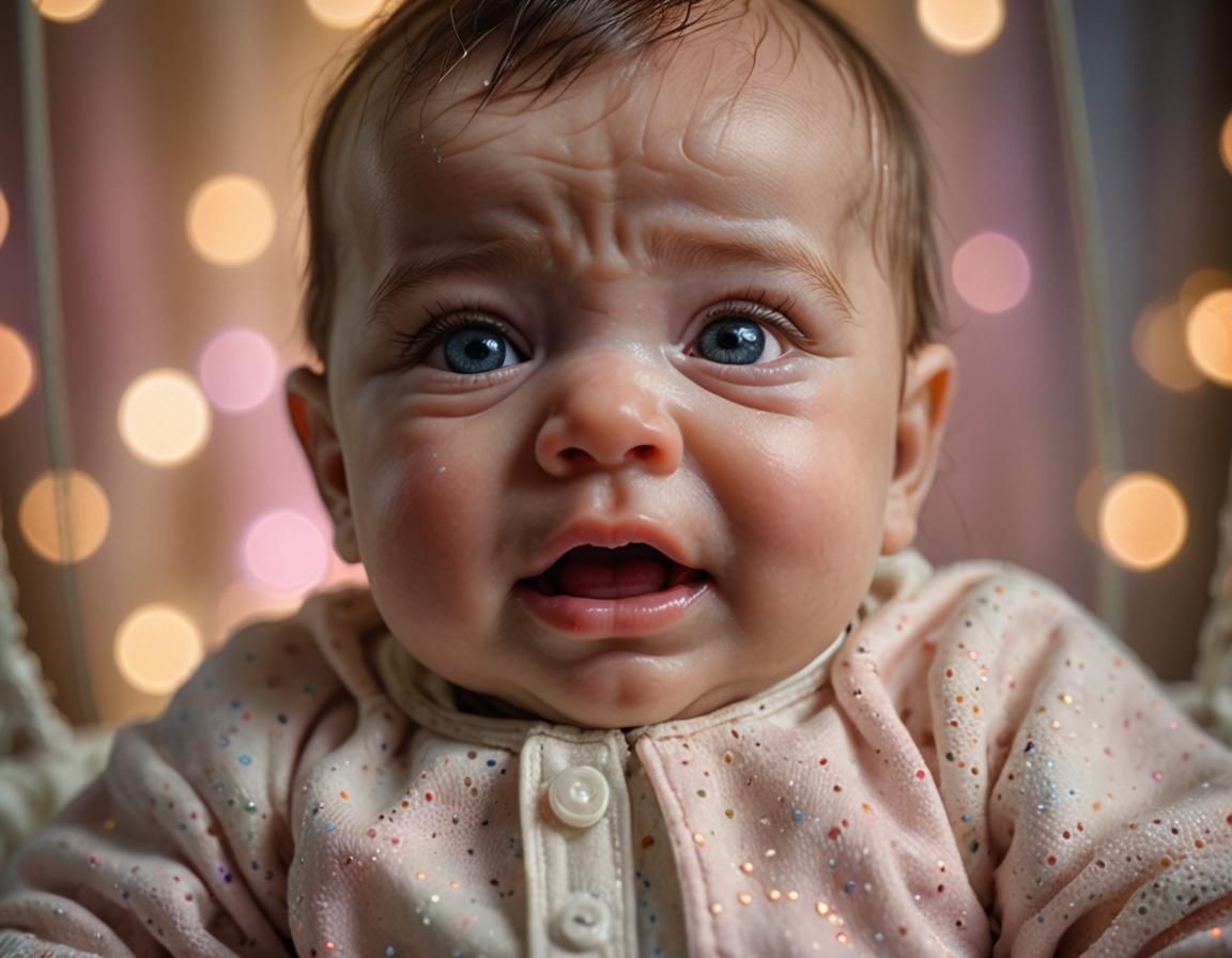 This image shows a baby crying in its crib, captured in a hyper-realistic style. The macro close-up photography features softbox lighting, pastel colors, and a gentle, intimate atmosphere.