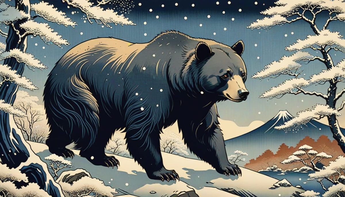 This traditional Japanese woodcut print depicts a serene scene of a sacred black bear standing alone in a Niseko forest, surrounded by gently falling snowflakes and warm golden light. Created in the style of ukiyo-e, with intricate textures and muted ink tones, this artwork captures the essence of tradit...