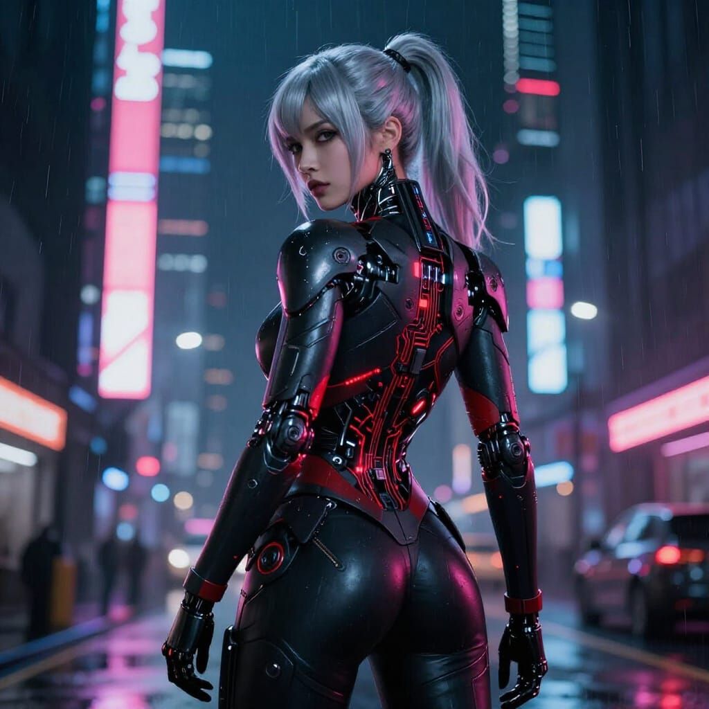 This image shows a highly detailed cyberpunk cyborg woman with silver hair in a neon-lit city at night. The artwork features a futuristic, high-tech aesthetic with cinematic lighting and volumetric fog.