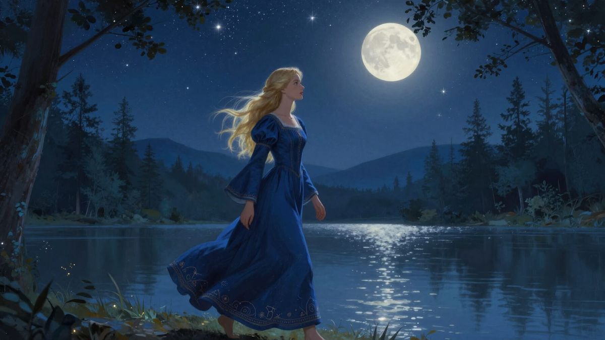 This luminous fantasy illustration depicts a blonde woman in a medieval maid dress by a forest lake at night. Moonlight illuminates her and a dense field of stars above, reflected on the water. Digital art with a serene, dreamlike atmosphere.