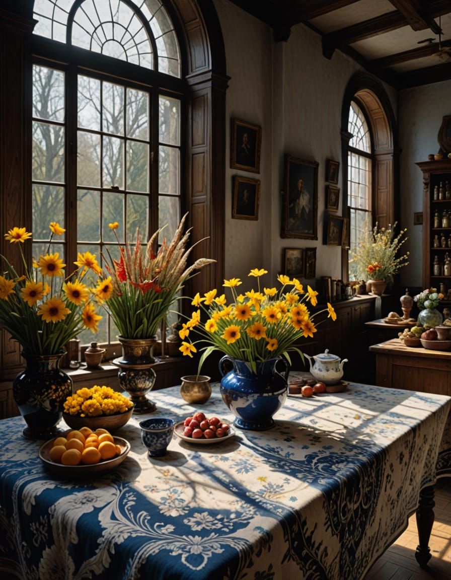 Close-up artistic superwide angle shot from near the ceiling looking down on an Old butcher Table covered by a fine tablecloth by a large bright window lots of freshly cut spring flowers and arranged Dry grasses bamboo and ornamental dried plants golden flowers and delft blue in a dimpled copper bucket ...