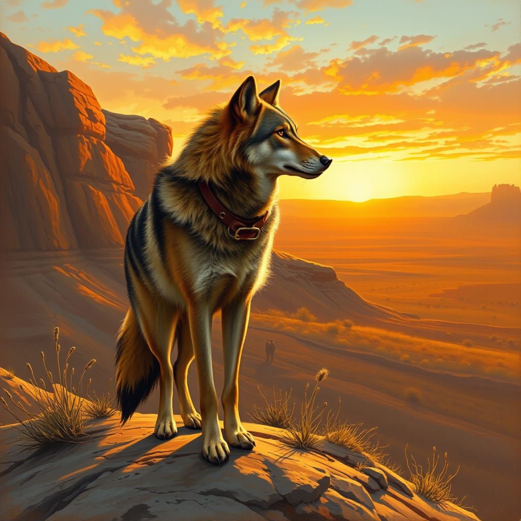 A striking picture of a wolf silhouetted against a sunset while standing on a mesa. The artwork evokes classic western paintings through its warm tones and dramatic lighting.