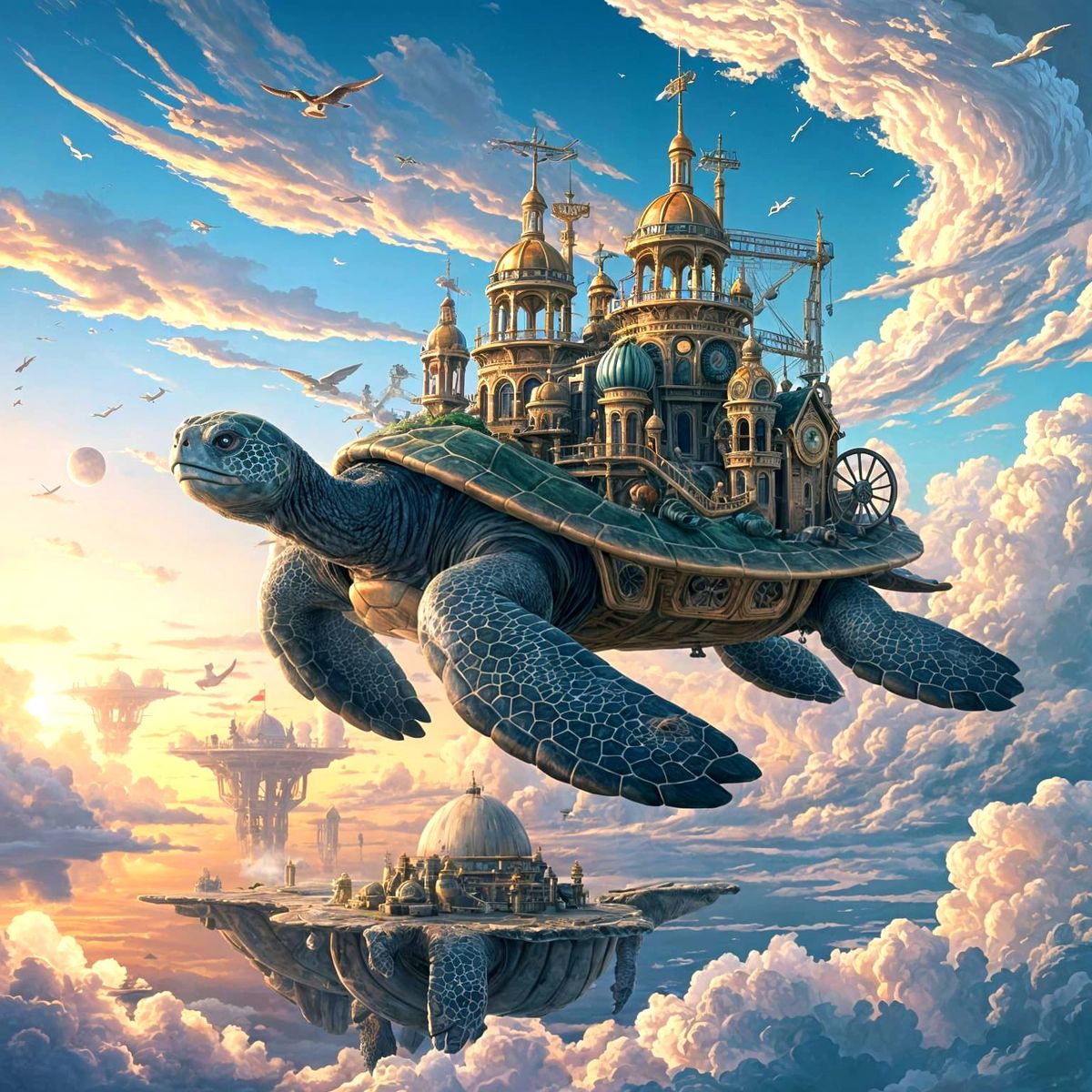 A Ghibli-inspired anime illustration shows a steampunk city on a giant, peaceful flying turtle. Floating islands and majestic clouds surround the fantastic scene.