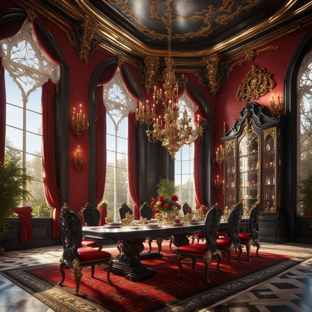 This image shows a lavish rococo gothic dining room in red and black, accented with gold. Large windows illuminate the scene with sunlight. The image is rendered as fantasy concept art.