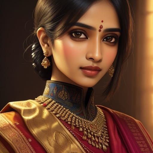 A vivid oil painting depicting a close-up of an Indian woman in a sari. The artwork showcases intricate fabric patterns, warm golden light, and soft, gentle colors in a traditional and elegant style.