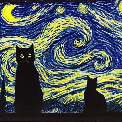 This image is a dreamy fusion of a romantic starry night and a curious black cat, reminiscent of the masterful styles of Rembrandt and Arkhip Kuindzhi, with a touch of modern whimsy.