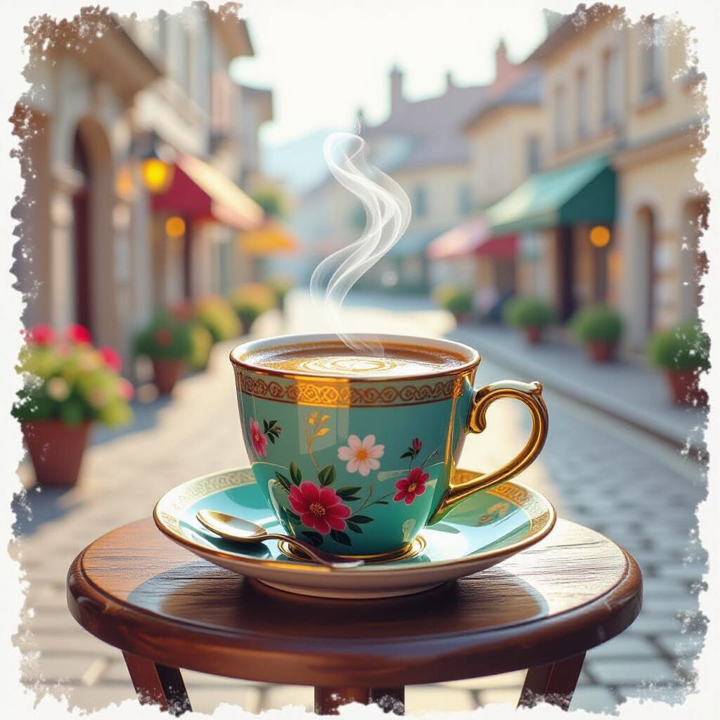This image showcases an enchanted coffee cup, vibrant with color and golden trim, reminiscent of Beauty and the Beast. It sits on a dark oak table with mystical, colorful smoke rising. Rendered in a detailed, imaginative digital painting style with dramatic lighting.
