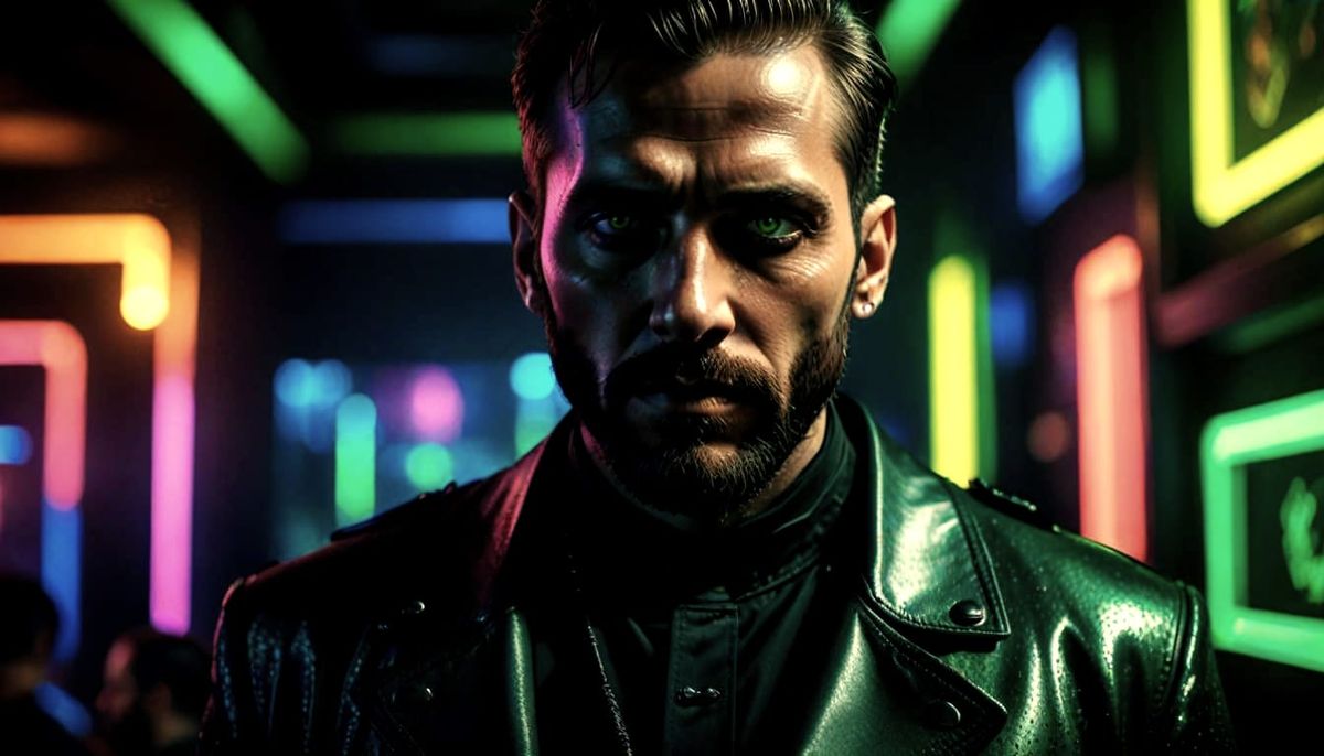 This image shows a close-up of an older male priest with black hair, stubble, and kind green eyes. He is unexpectedly wearing tight leather clothing in a nightclub setting.