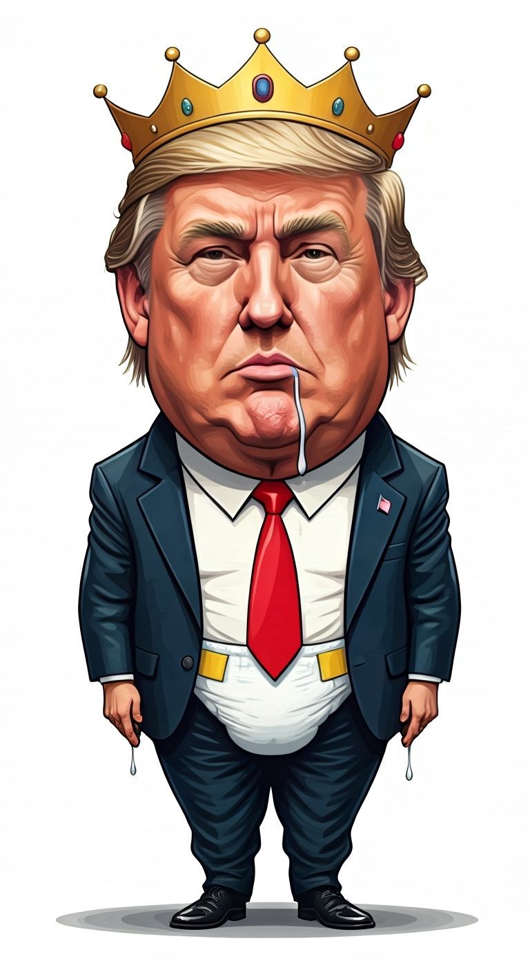 This image features an unflattering caricature of Donald Trump as a king, styled after classic newspaper political cartoons with bold lines and stark shadows.
