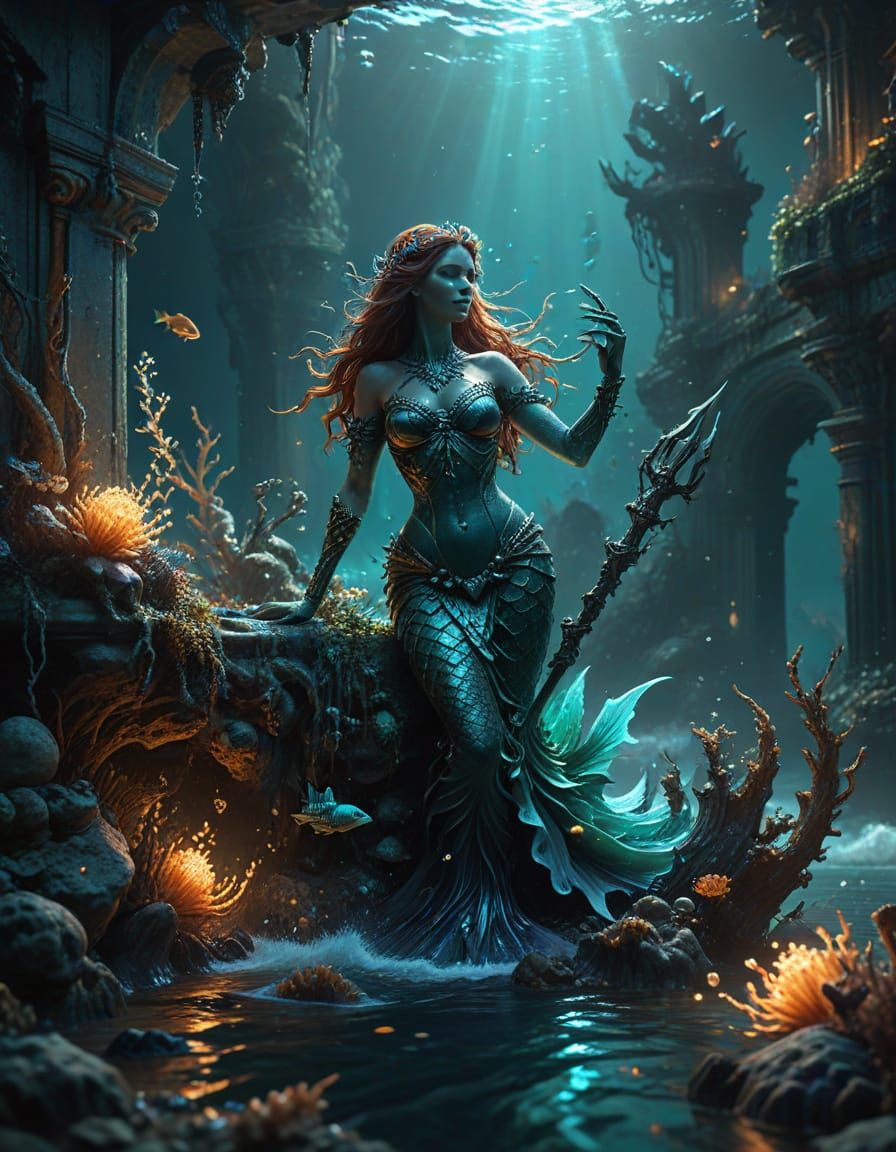 This enchanting oil painting depicts a mystical mermaid queen, surrounded by a shipwreck, anglerfish, and a sunken cathedral, with sweeping impasto strokes and chiaroscuro lighting, evoking a sense of fantasy and wonder.