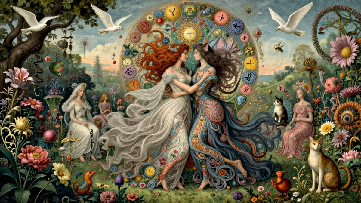 A surreal scene unfolds with a woman and cat in elaborate attire at a garden party, featuring giant flowers, strange beings, and fantastical flora, rendered in a unique double exposure style with biomechanical touches.