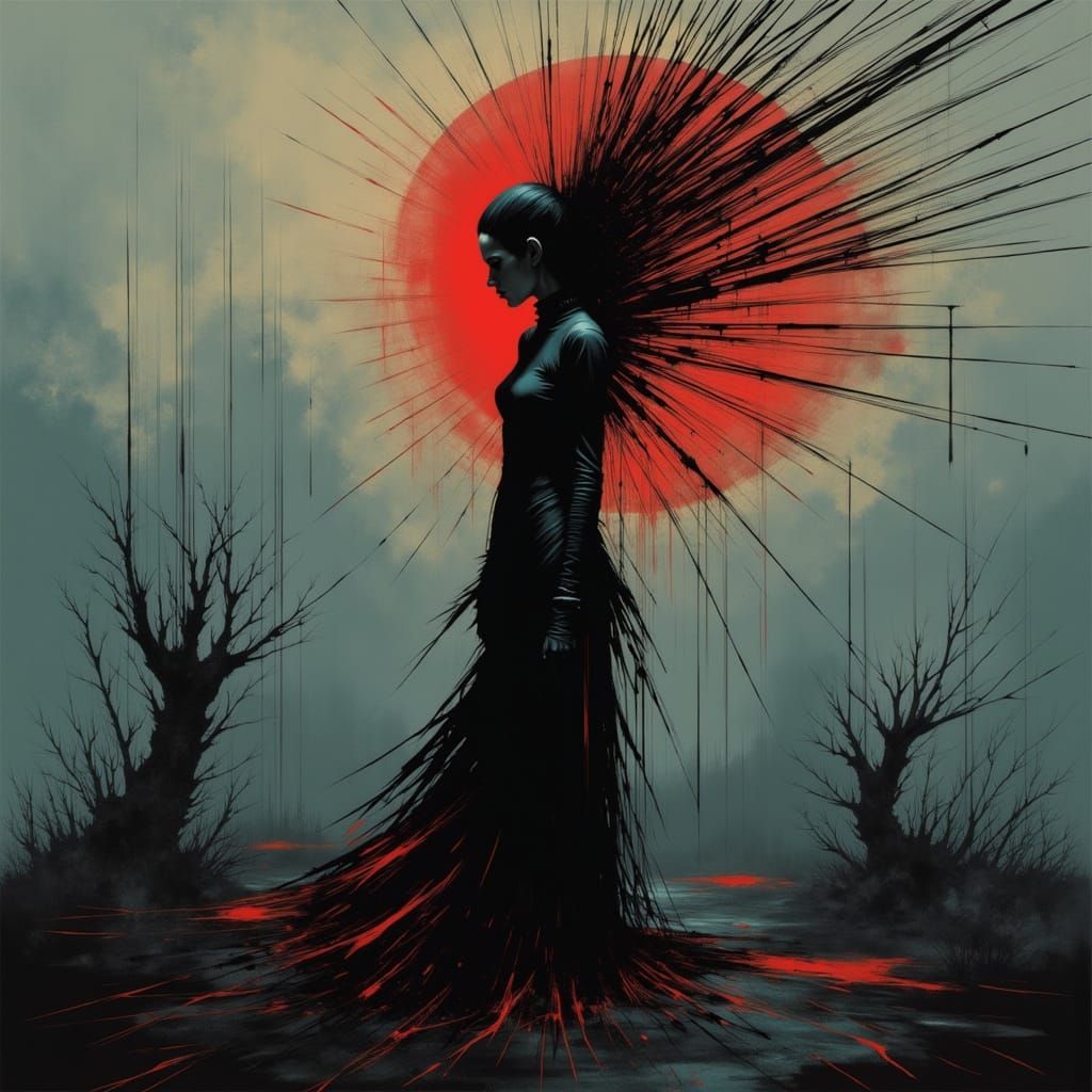 This image shows a figure's silhouette against a desolate charcoal landscape, illuminated by red and aqua light. Fractured gold lines emanate, symbolizing inner pain. Rendered in a gothic punk style with dramatic lighting.