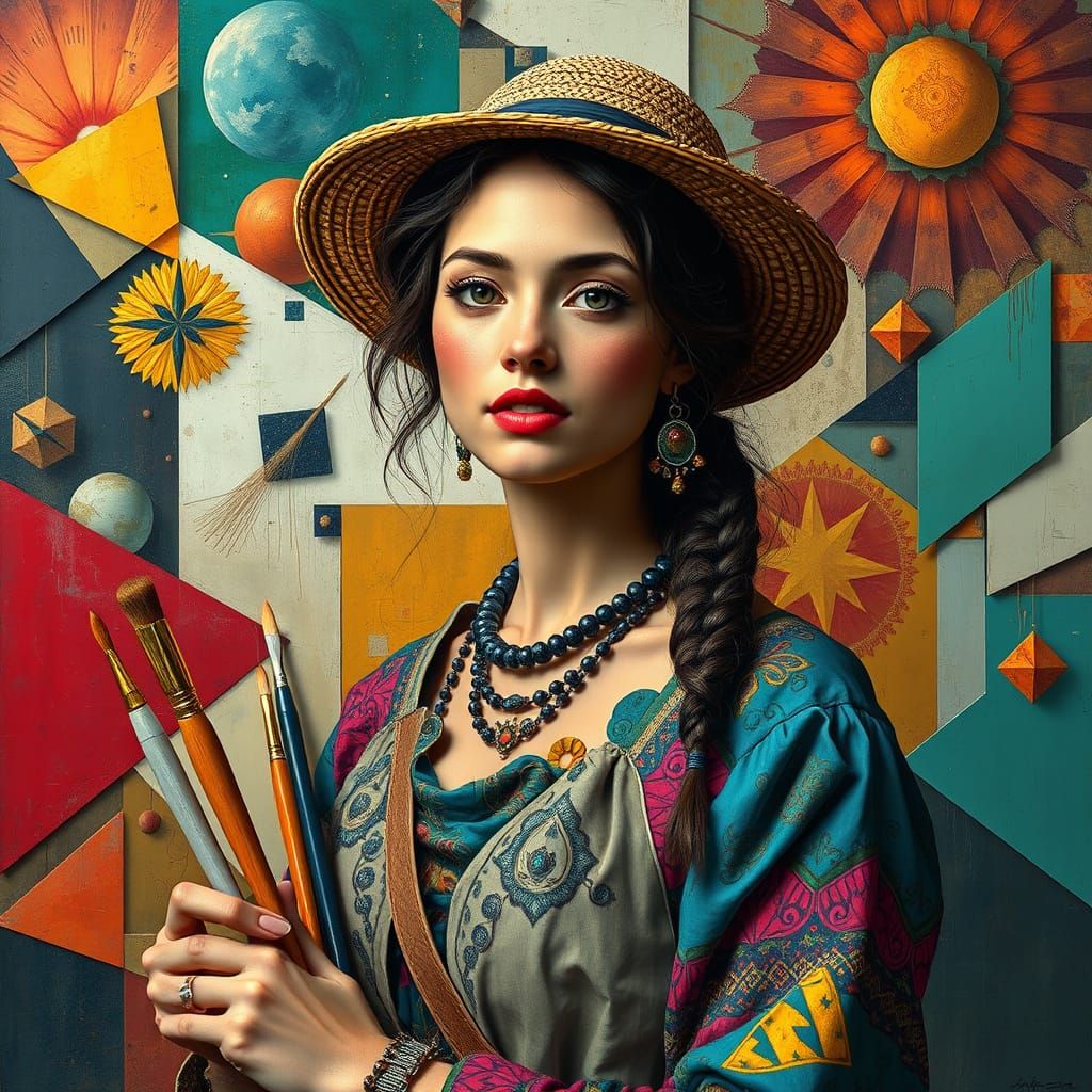 A hyperrealistic image of a painter in colorful clothing, surrounded by geometric shapes and textures. The artwork is reminiscent of abstract cubism with dreamlike and futuristic elements.