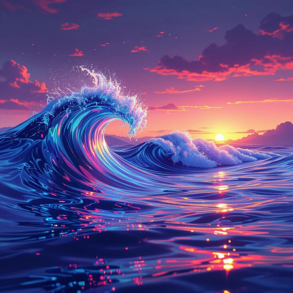 This image shows vibrant, iridescent waves in constant motion. The image has a futuristic and sleek design with smooth gradient transitions, in a cyberpunk aesthetic and captured in 4K resolution.