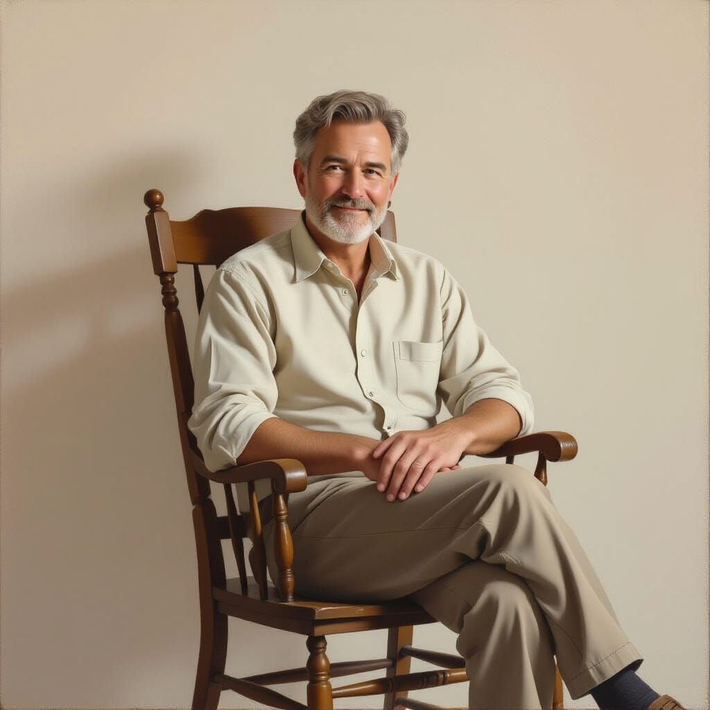 This image shows a middle-aged man sitting in a softly lit room, radiating warmth and calm. The scene is rendered in a painterly style, with muted pastel tones, creating an intimate and poetic atmosphere.