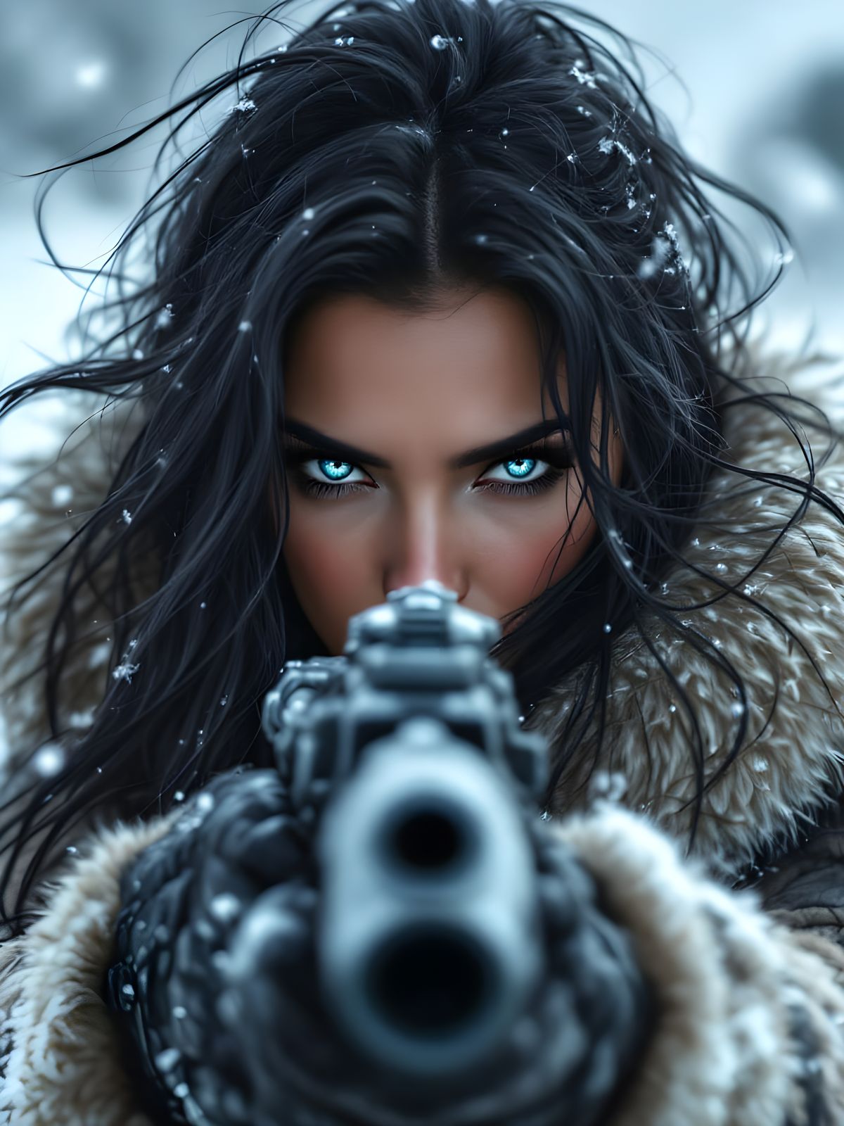 A striking comic book style portrait of a woman in furs, focusing on her intense silver-blue eyes and wavy black hair, with a futuristic rifle aimed forward.
