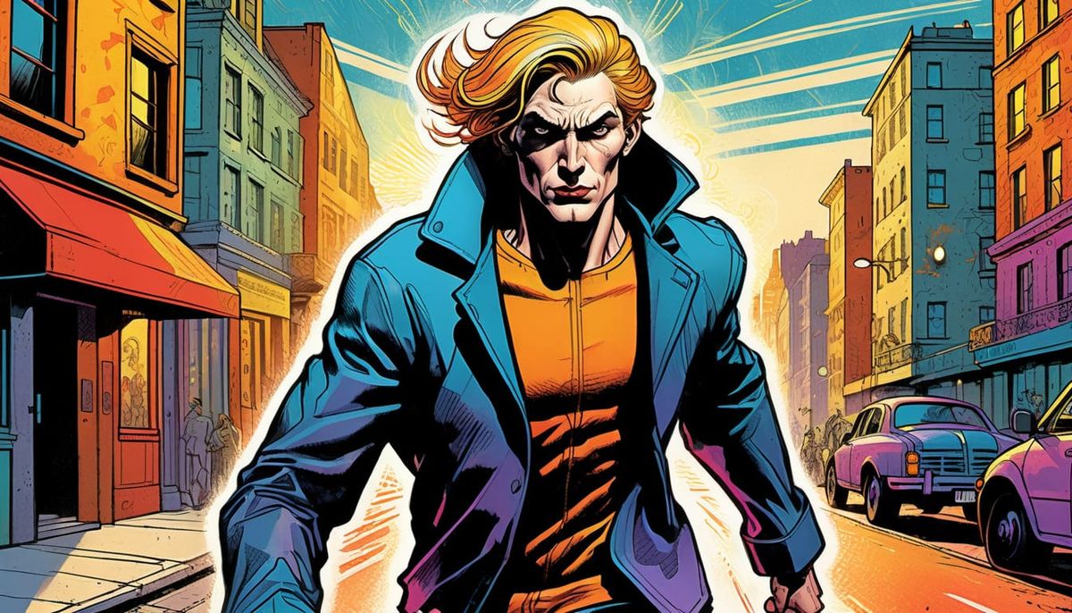 A humorous image of a thief running out of gas, rendered as comic book art. The picture captures vibrant fauvist expressionism with warm sunlight and exaggerated, caricatured features.