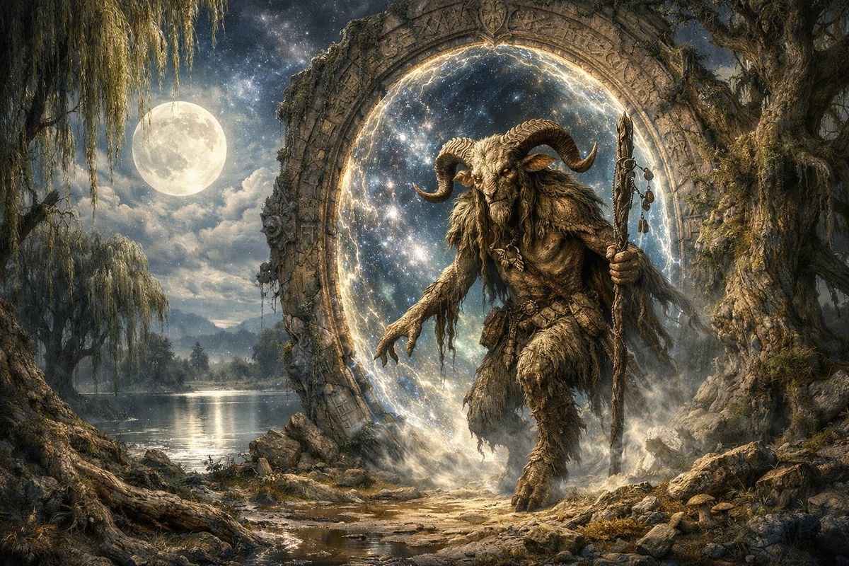 This image shows a hyperrealistic fantasy scene with a gigantic portal revealing an ancient faun. A full moon illuminates a misty landscape with a reflective lake and gnarled trees.