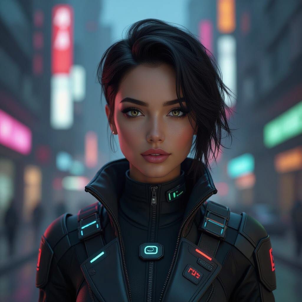 A 3D render of an androgynous woman with short hair and futuristic clothing in a futuristic city. The image features lighting and textures reminiscent of digital artwork.