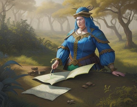 This image shows a plus-sized Saurial warrior in modest attire sketching a map amidst shrubland. The illustration features hard shadows and evokes a photographic style.