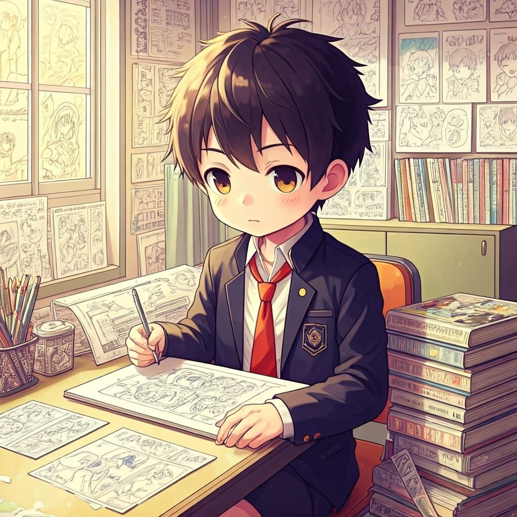 This image shows a boy in a school uniform drawing anime. The scene is set in a colorful Japanese high school, with manga books and sketches surrounding him in an anime aesthetic.