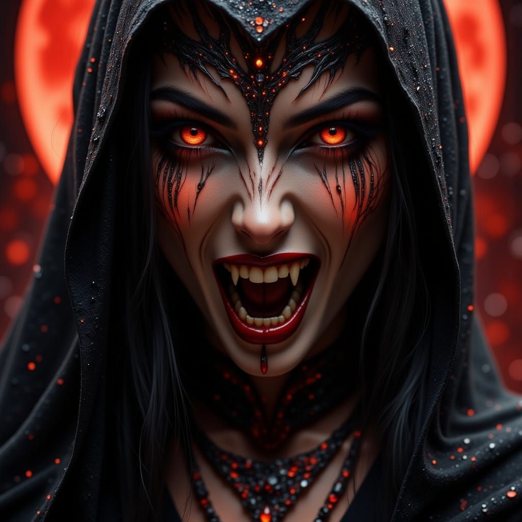 This image shows a powerful sorceress with piercing red and orange eyes and razor-sharp fangs, set against a dark fantasy backdrop illuminated by a blood red moon