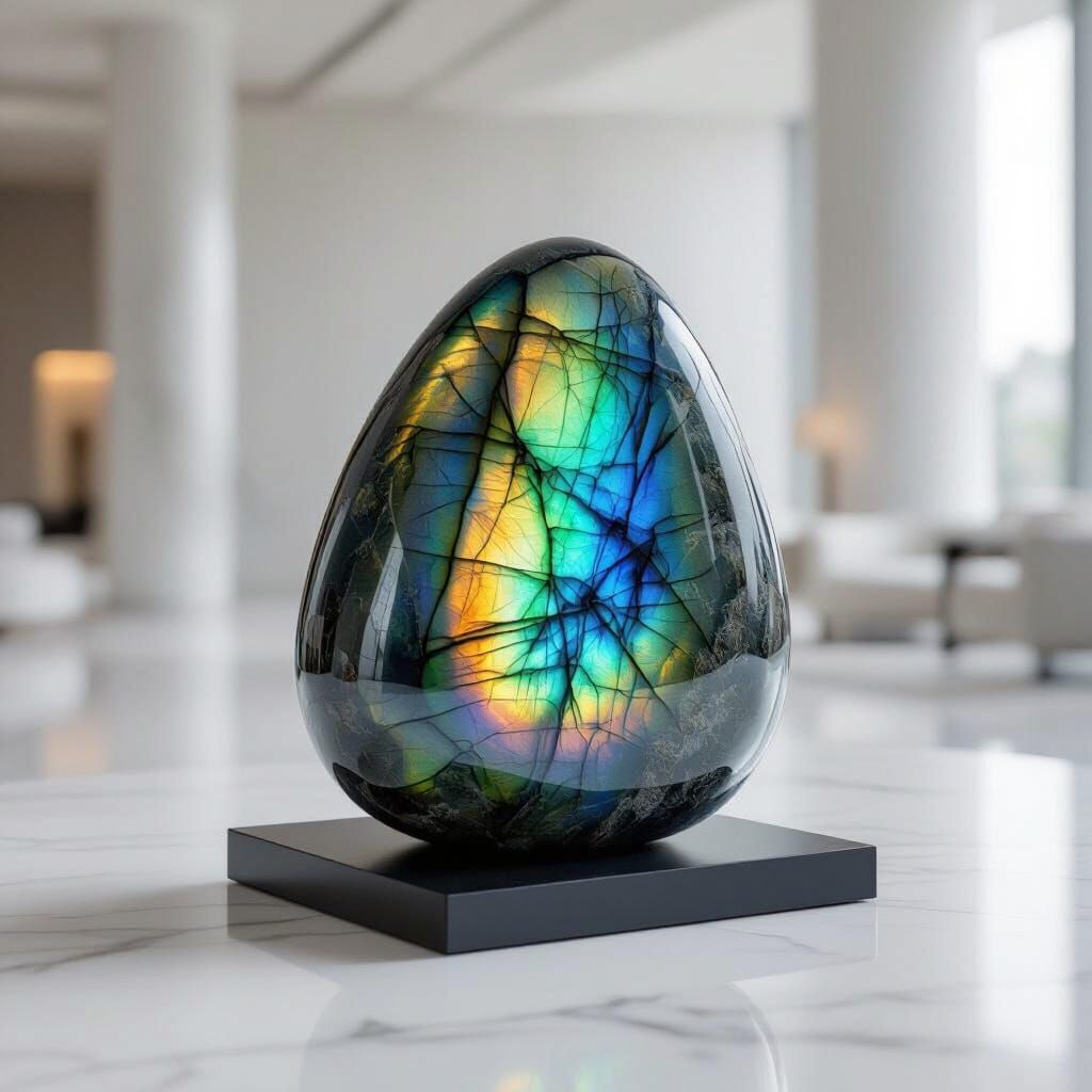 This image showcases a photorealistic video style. It features a labradorite stone smoothly transitioning from a close-up to a full view within a minimalist building lobby, rendered in cinematic 8k resolution with subtle lighting.