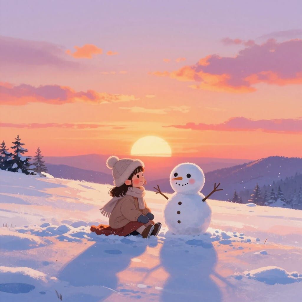 A heartwarming illustration of a young girl and her snowman on a snowy hill, captivated by a stunning sunset. The scene captures innocent wonder with soft, diffused light and enchanting colors.