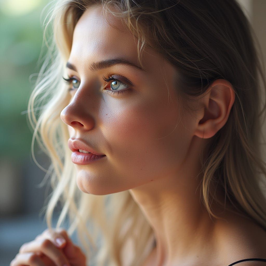 This image shows a serene woman wearing a swimsuit, enjoying a relaxing moment near the ocean. Created with a focus on subtlety and tranquility, this artwork embodies the carefree spirit of a beachside escape.