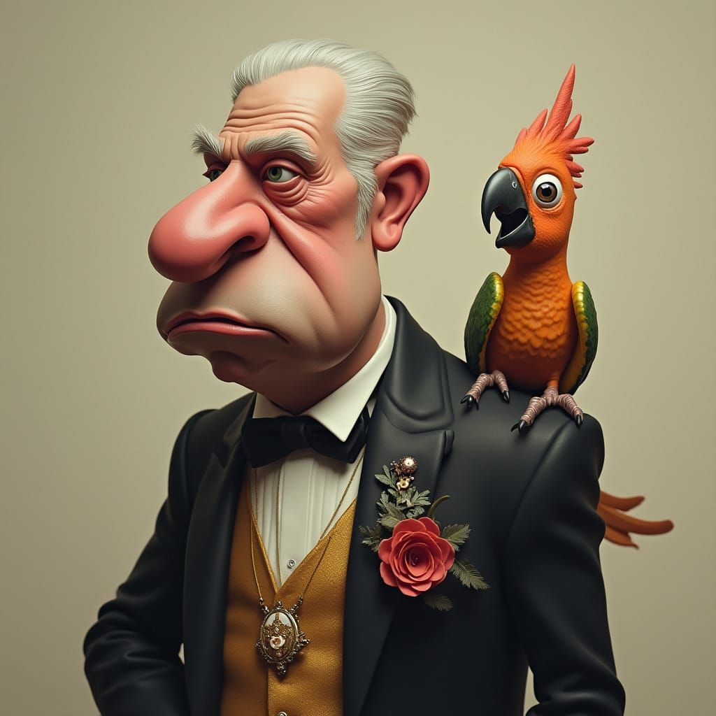This image features a somber aristocrat with a lively parrot on their shoulder, rendered in a glossy, exaggerated style with bold humor and sculptural wit.