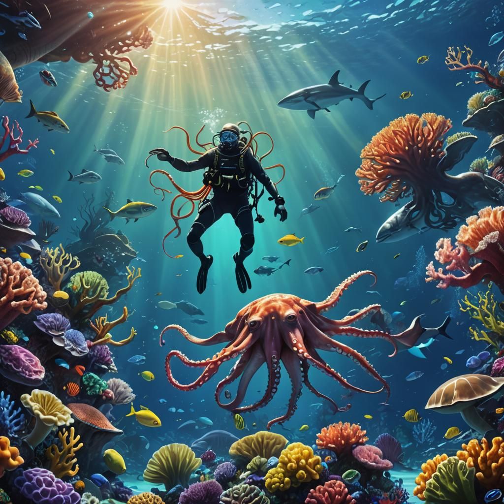 A striking picture of a scuba diver amidst a vibrant coral reef teeming with marine life. Sunlight filters through the deep blue water illuminating an octopus, shark, and distant blue whale in this fantasy ocean scene.