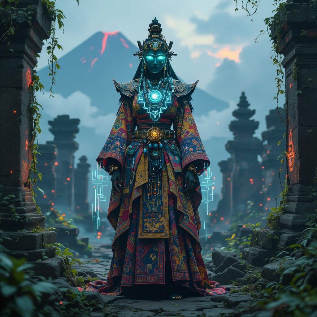 A striking picture of a Nusantara guardian amidst temple ruins. The figure wears batik clothing and holographic armor, surrounded by spiritual symbols and glitch energy in a mystical, futuristic scene.