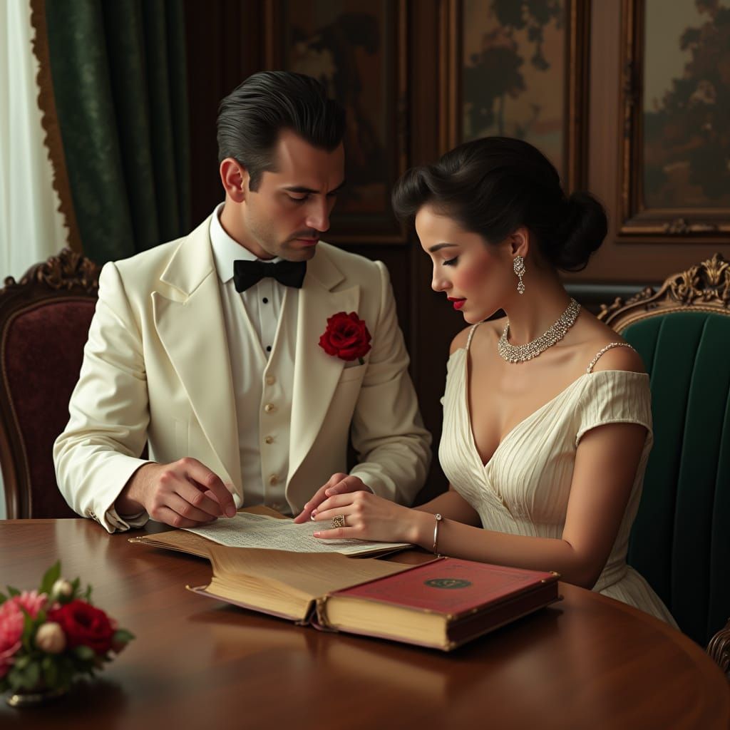 Uma cena elegante e refinada em uma sala aristocrΓ‘tica dos anos 1950, onde um homem de traΓ§os fortes, cabelos escuros com fios grisalhos e um olhar penetrante veste um impecΓ‘vel terno branco com uma flor vermelha presa ao paletΓ³. Sentado em uma poltrona de couro verde, ele observa atentamente uma linda ...