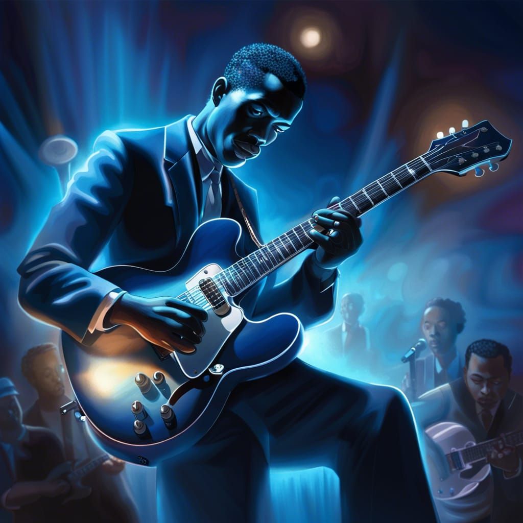 A hyperrealistic image of a Black blues guitarist performing in a smoky 1950s nightclub illuminated by blue lights. The artwork features vibrant colors and intricate details.