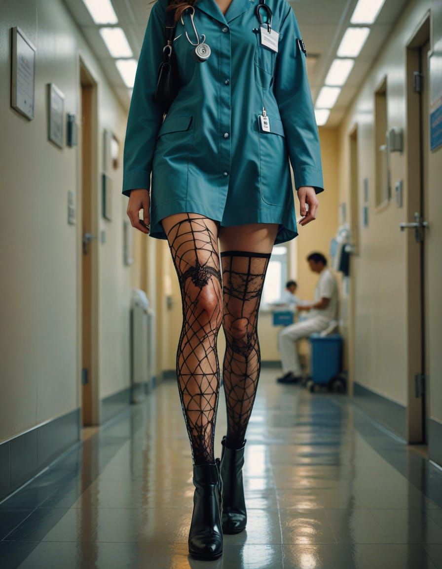 This image shows a young woman walking down a hospital corridor. The digital art piece features vibrant colors and a glossy, hyper-realistic oil painting style.