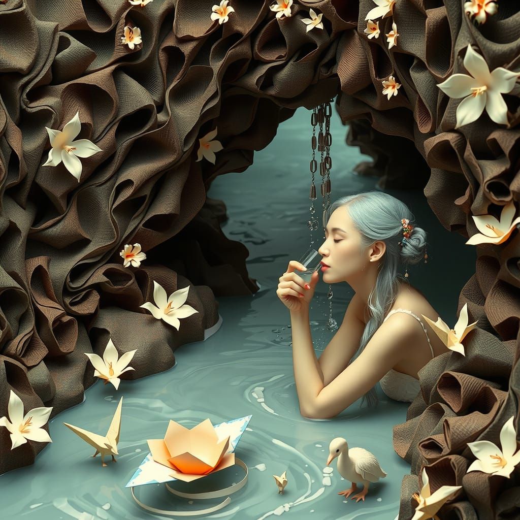 This image shows a serene woman drinking from the Fountain of Youth in a mystical cove. The surrounding origami paper folds and papercraft create a dreamy, ethereal atmosphere in a surrealist style.