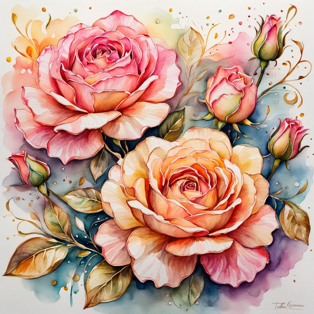 This image showcases a beautiful watercolor sketch of pink roses transformed into a delicate brooch, characterized by soft brushstrokes, vibrant triadic colors, and warm golden lighting, reminiscent of Tatiana Khazova's style.