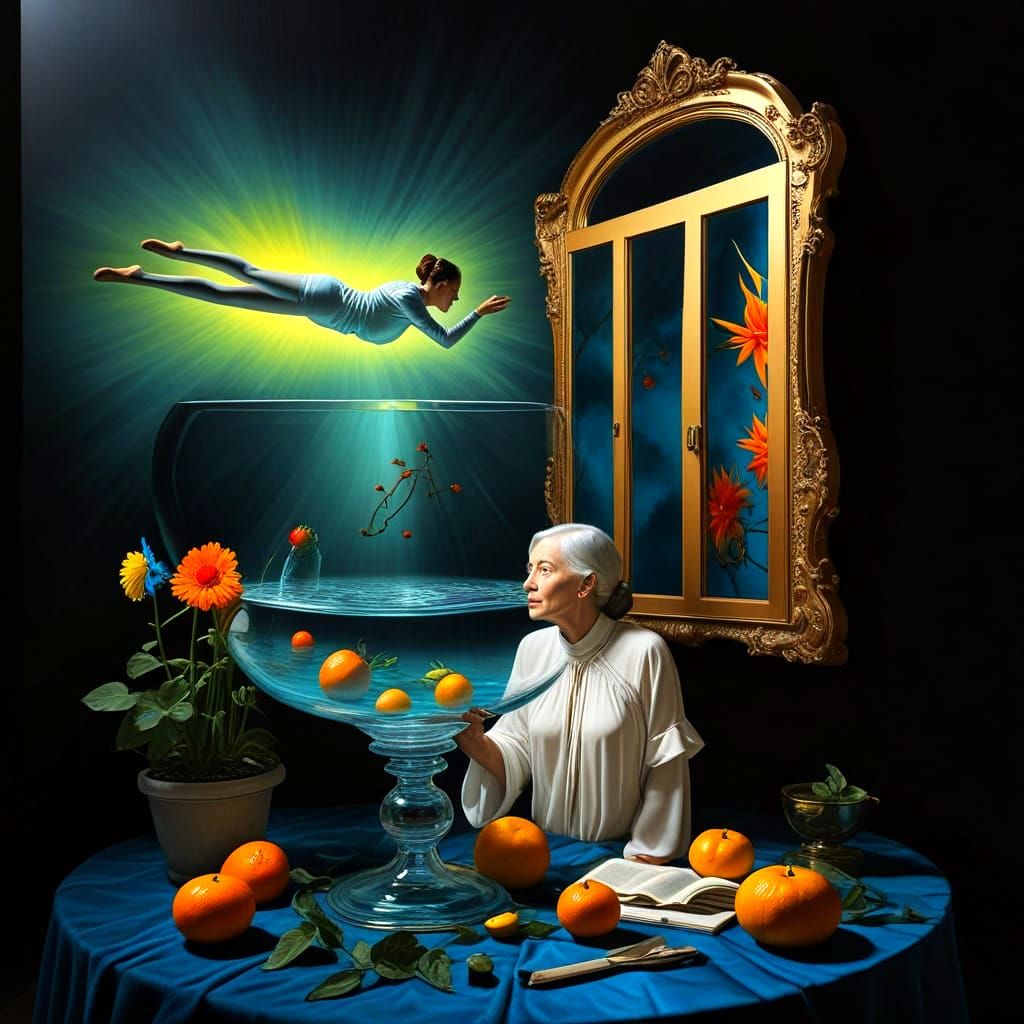 beautiful mature ladies, fantastic surreal image, mirrors, water surface, reflections, vibrant luminous colors, intense contrasting colors, sharp focus, great focal depth, highly detailed, high definition, ultra quality, fantasy, illusion, paradox, mystery, surrealism, photorealism, hyperrealism, minimalism, ...