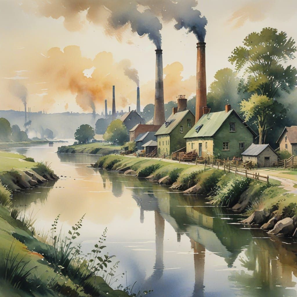 This serene landscape painting depicts a tranquil river scene with rustic cottages and lush greenery, subtly contrasted with the distant presence of industrial modernity, showcasing the delicate balance between nature and progress.