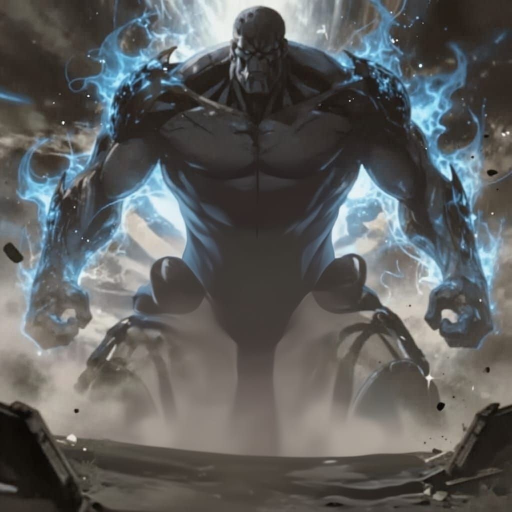 This image shows Mikasa Ackerman in a close-up view during a dramatic transformation into a colossal titan. The scene features a chaotic battlefield and high-contrast lighting, evoking dark fantasy concept art.
