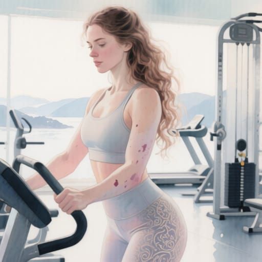 This image shows a beautiful, feminine woman with long wavy hair exercising in a gym. Rendered in a soft, low-contrast watercolor style with delicate colors and visible brushstrokes, creating a serene atmosphere.