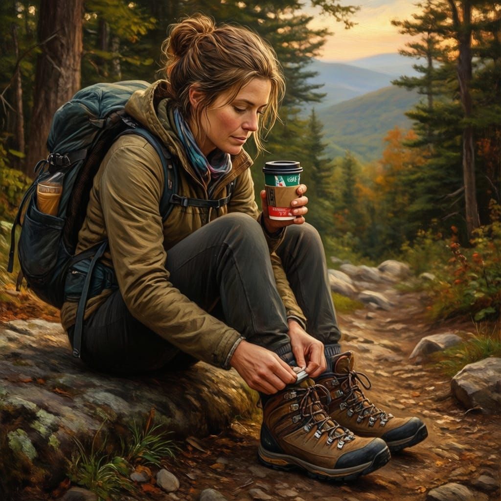 This image shows a woman taking a break on the Appalachian Trail, enjoying coffee at golden hour. Rendered in a realistic concept art style with earthy tones and soft light.