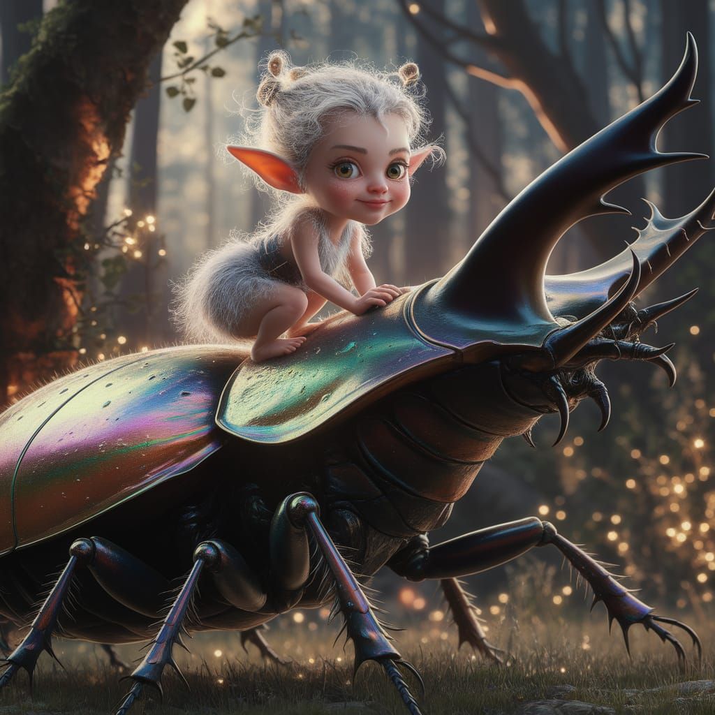 This image captures a close-up of a mischievous forest sprite perched atop a colossal stag beetle, set amidst a bioluminescent forest with intricate textures and glowing flora and fauna.