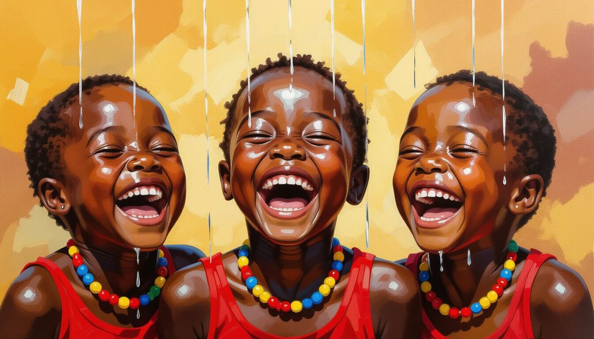 This impressionist painting captures three laughing African children with radiant joy. Loose brushstrokes and vibrant colors evoke innocence and vitality.