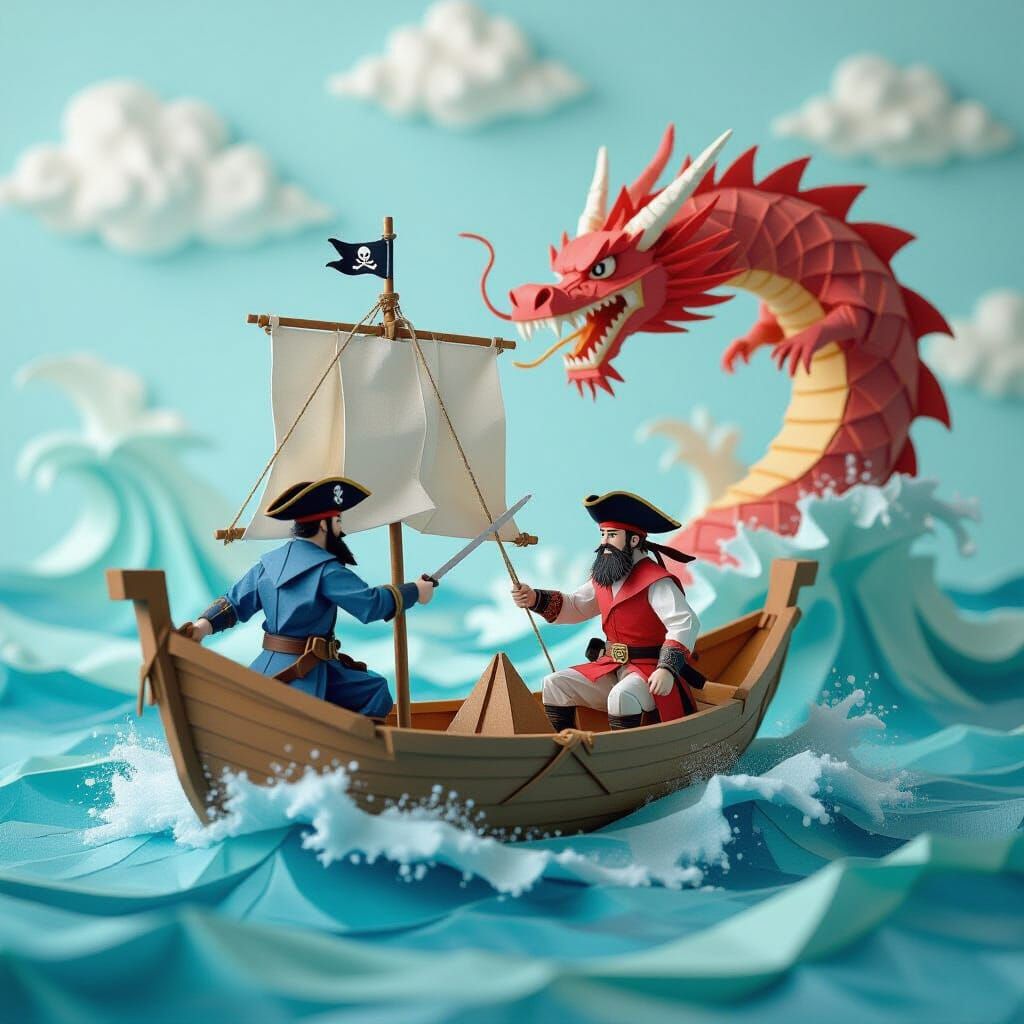 This image shows origami pirates struggling in a storm on the sea. A large origami dragon rises from the waves, all rendered with realistic paper textures in a fantastical style.