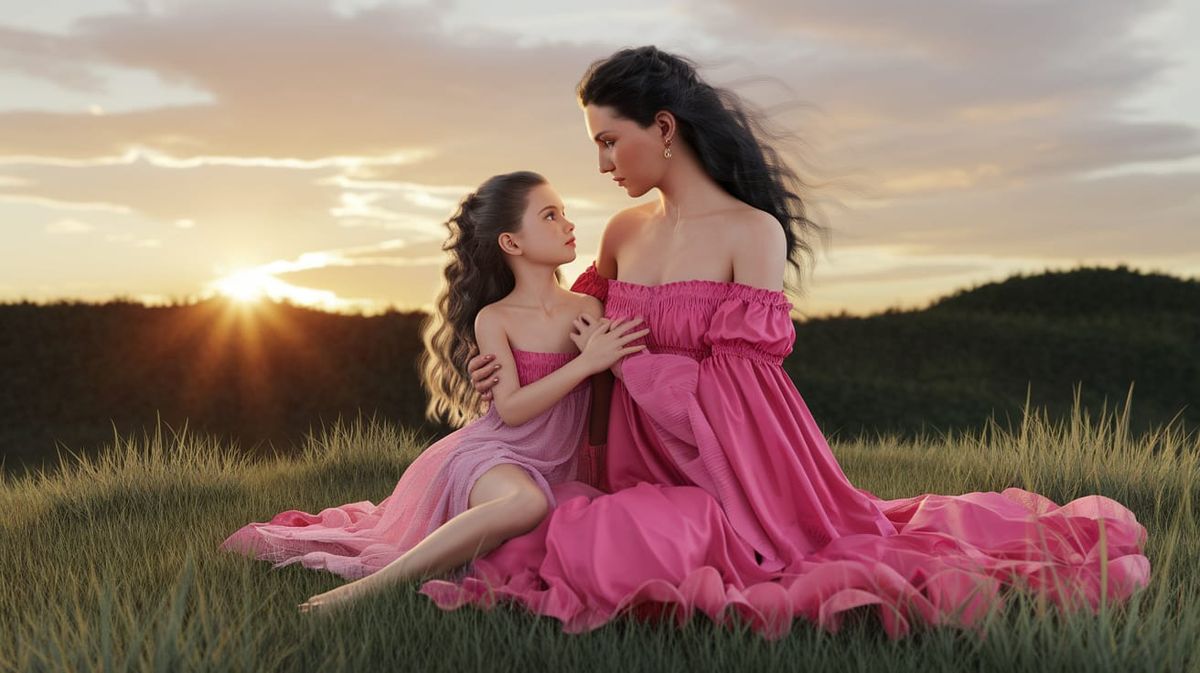 A vibrant art brut image of a woman and a girl silhouetted against a sunset. The artwork features intricate details and a bright, delicate, and dramatic color palette.