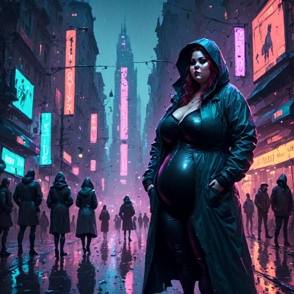 A lone woman gazes at city lights in a crowded, rainy cyberpunk metropolis. The scene has a dark, moody atmosphere with neon lights, wet streets, holographic ads, and a high-tech, dystopian aesthetic.