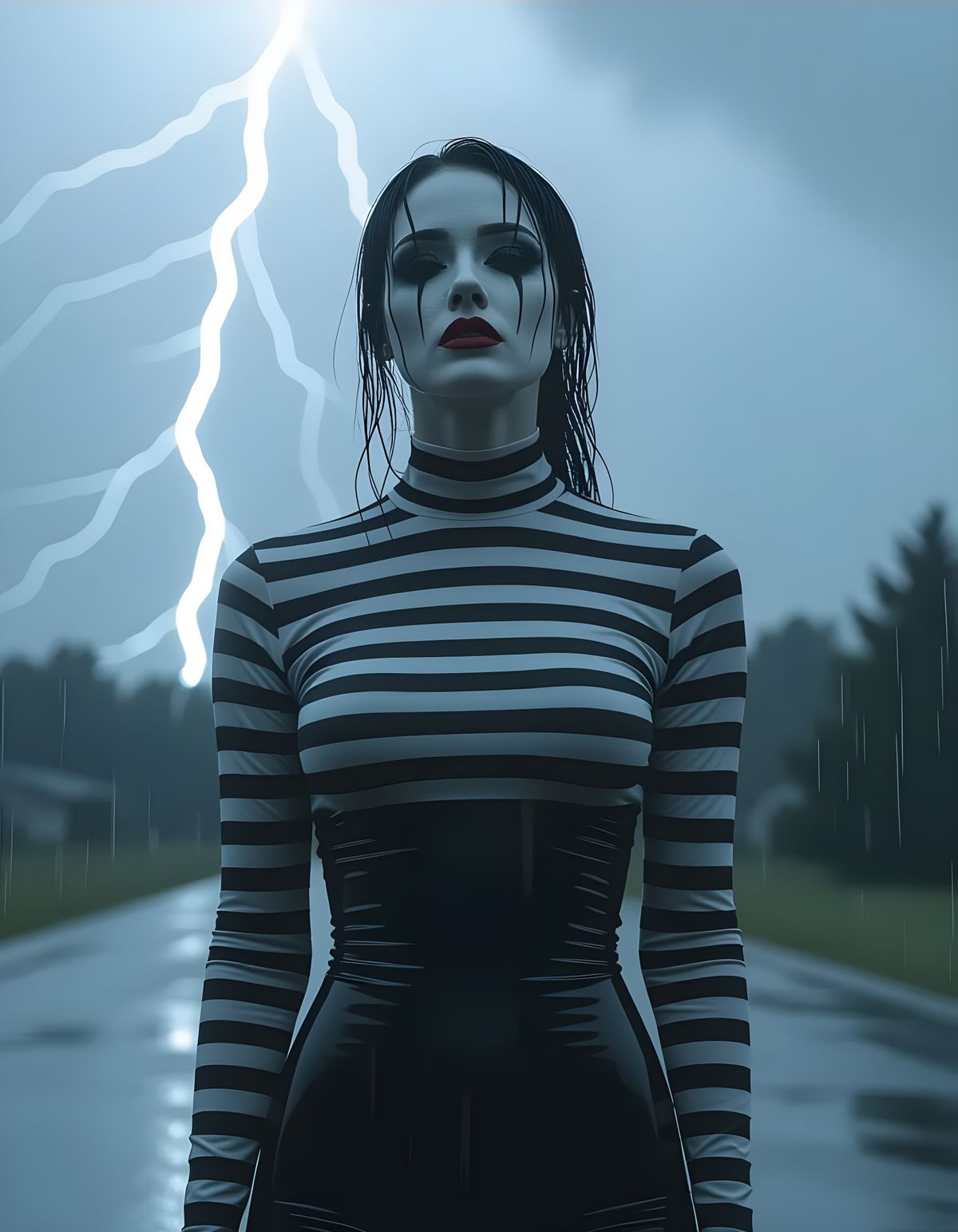 This image shows a mime in the rain with dramatic, cinematic lighting. The photorealistic 8k image depicts a woman in black and white attire with makeup running.