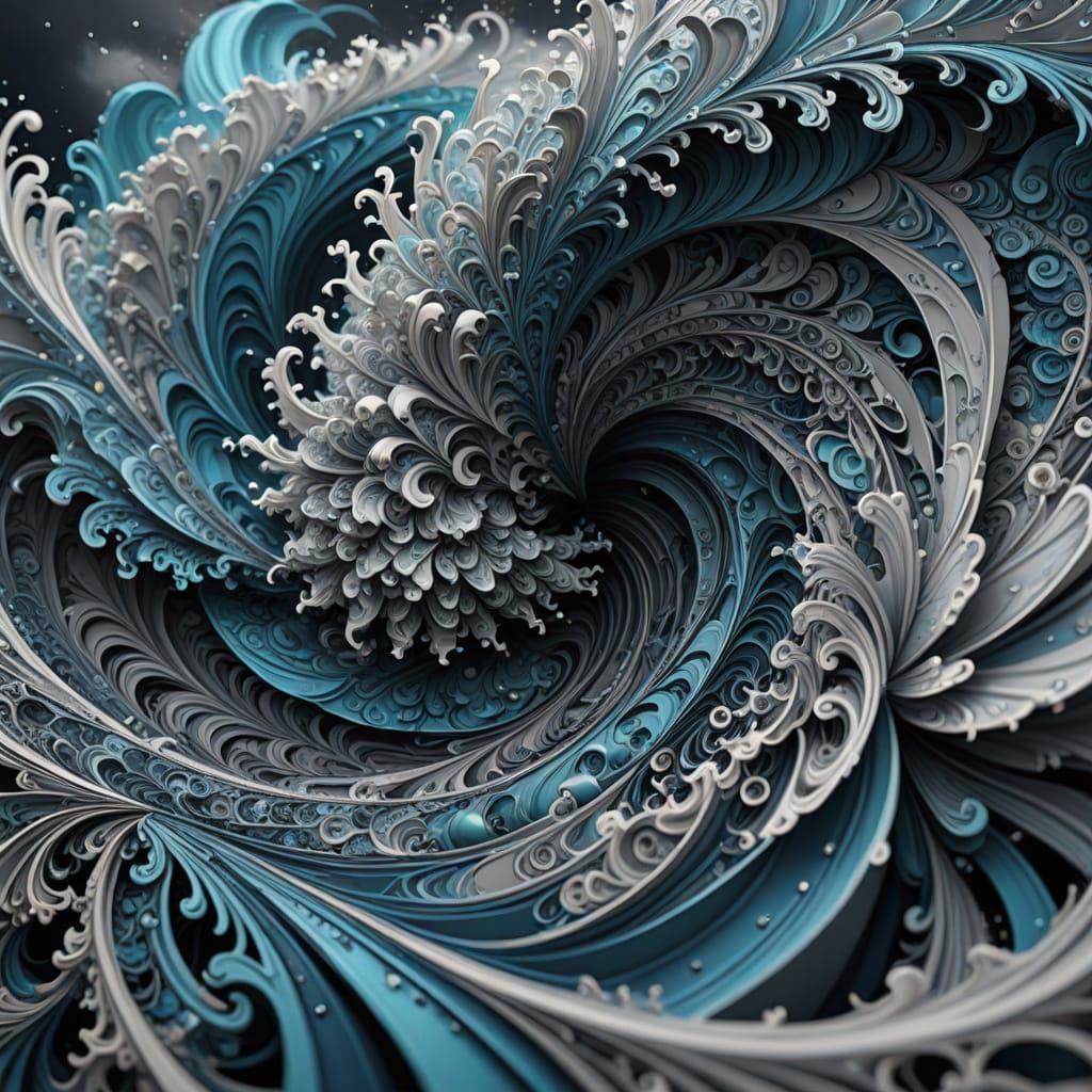 This image shows a swirling hurricane over the Florida Keys, rendered as an intricate abstract vector fractal with Zentangle-inspired details. Features a dramatic 3D shading and an electric blue and stormy grey color palette.